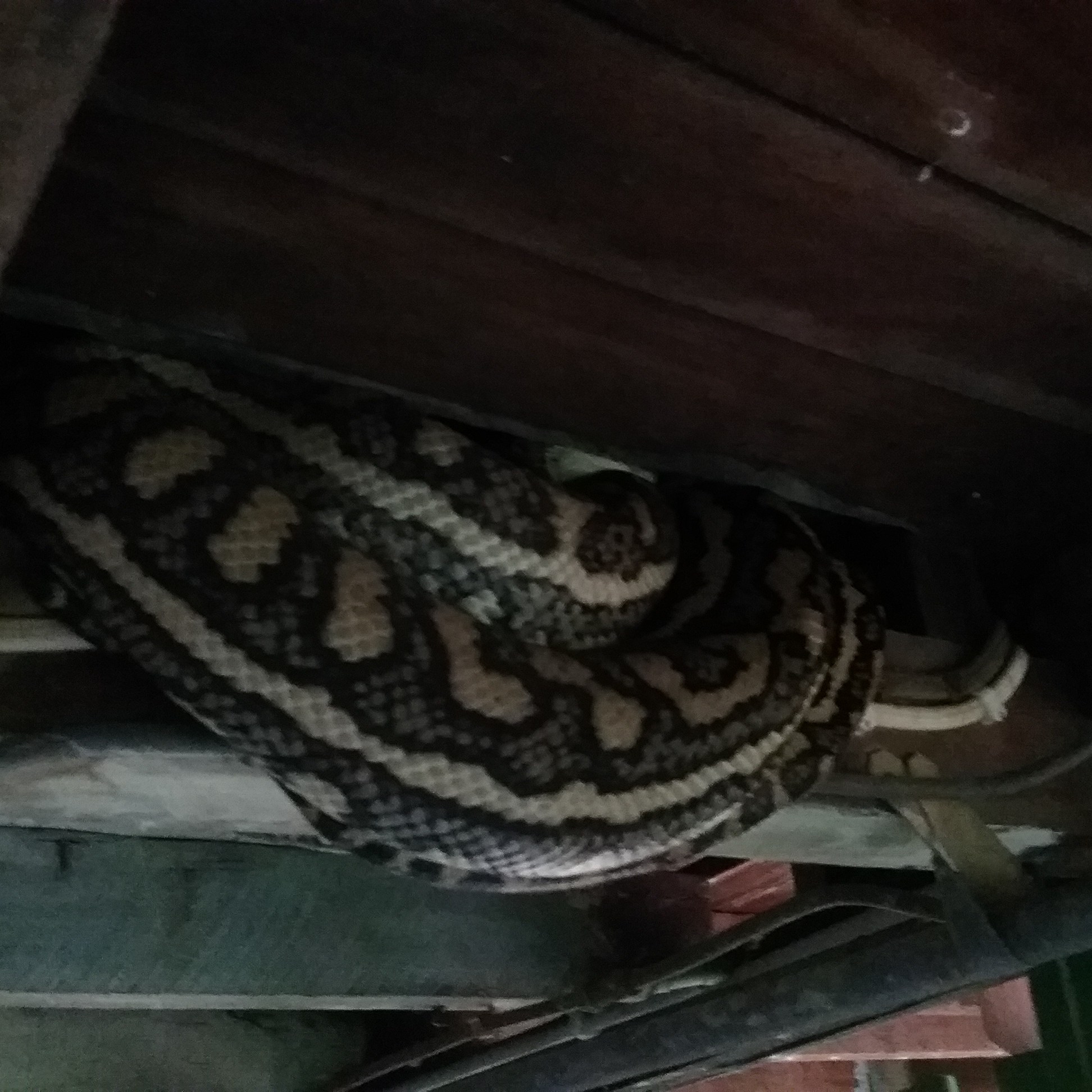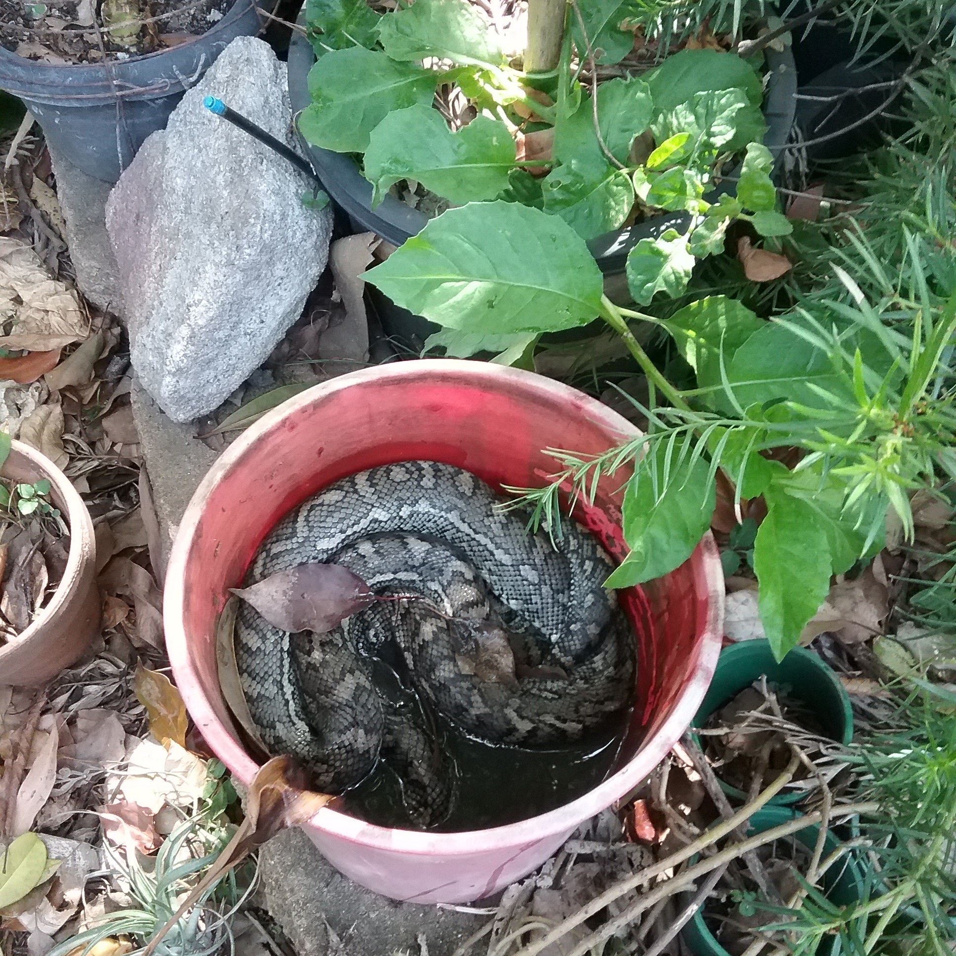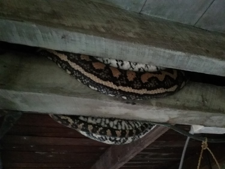 Not sure if this is the same one. He turned up yesterday. I’ve seen lots of pythons and their shed skins since 1986 but not often in the daytime. I got a bit worried at this point with his trying to go through one of the plant covers used to thwart scrub turkeys.