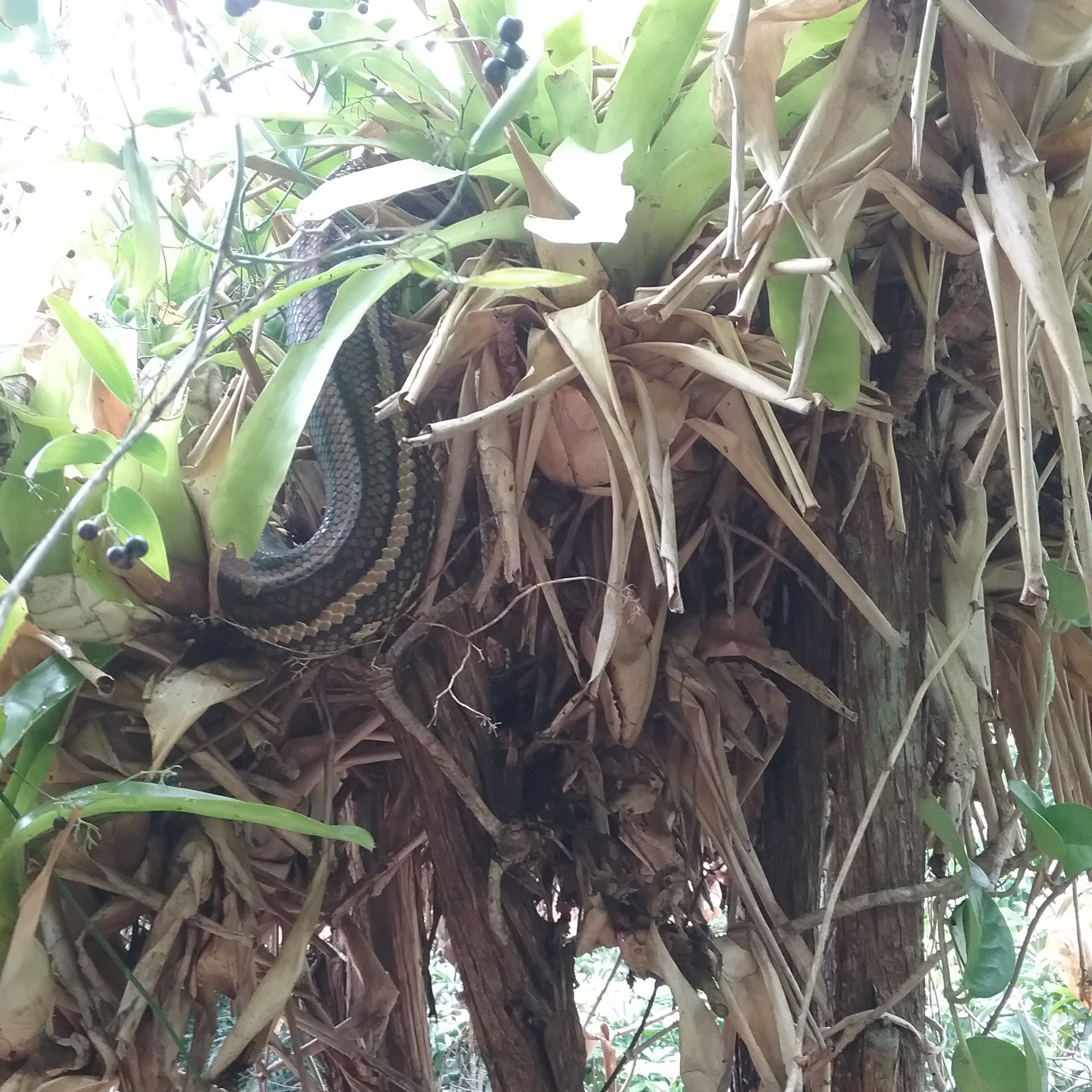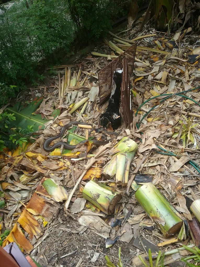 He is getting altogether too bold. I’ve found him sunning himself near the bananas several times.